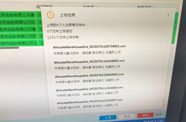 解决方法:重点药品通常包括麻醉药品、精神药品、医疗用毒性药品和放射性药品等,这些药品上传时,必须填写“配送单位”,方可上传成功。