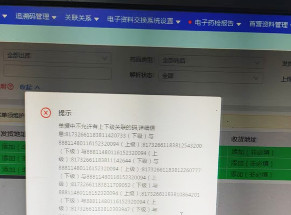 解决方法:出现“单据中不允许有上下级关联的码”等提示,是因为扫码时,将大码或中码,连同小码一起扫描采集上传了,导致报错。此时,可忽略重复的数据,按提示删除即可。以后扫码时,扫了大码,就无须扫中码和小码。扫了中码,就无须扫小码,以免重复上传。