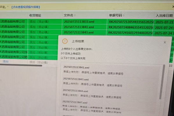 解决方法:在电脑D:\SFDA\InData文件中,用记事本打开文件,逐一手动修改单据号,即可重新上传成功。