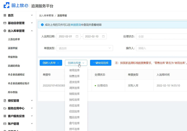 出库类型有零售出库(RetailWareHouseOut)、销售出库(SalesWareHouseOut)、退货出库(ReturnWareHouseOut)、抽检出库(CheckWareHouseOut)和销毁出库(DestoryWareHouseOut)等,零售出库面向终端消费者销售,销售出库用于企业间药品销售,抽检出库和销毁出库则分别对应药品检验和报废处理的出库场景。不同类型对应专属业务编码,确保追溯链条精准可查。